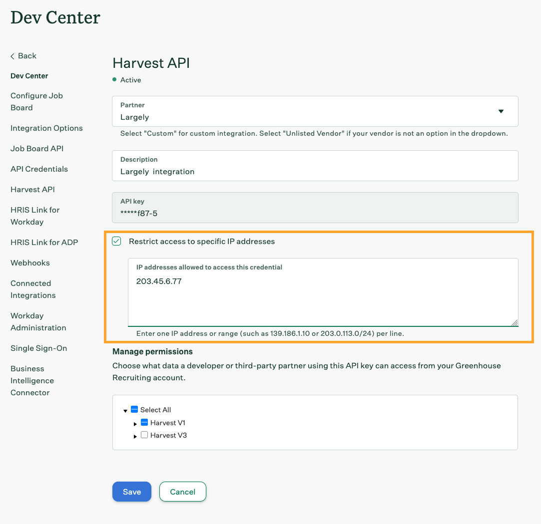 Access to Harvest API is controlled through API credentials. Site Admins can assign permissions to specific endpoints or scopes, limit usage to trusted IP addresses, and revoke/re-enable credentials as needed.