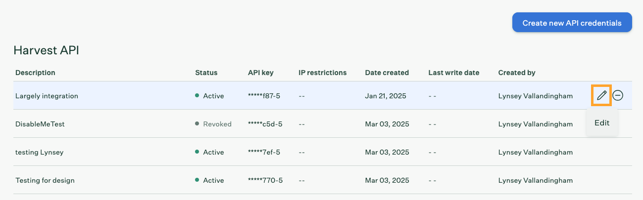 Revoke and re-enable a Harvest API credential