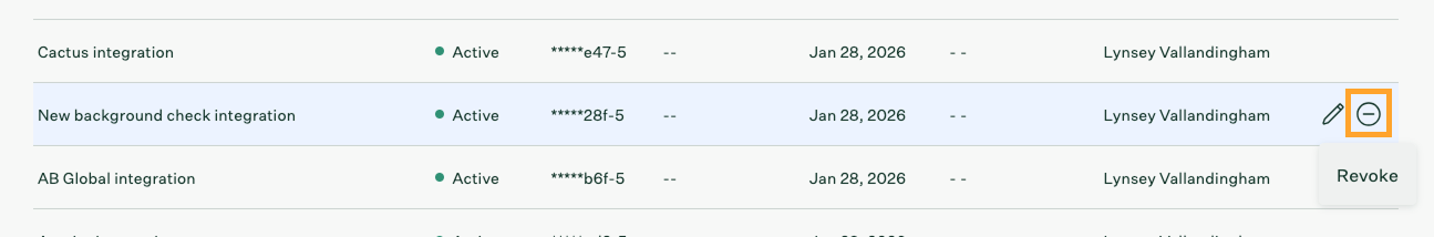 Note: Revoking an API key immediately removes access to the key for all users and integrations. Double-check that the API key you're revoking is the correct key.