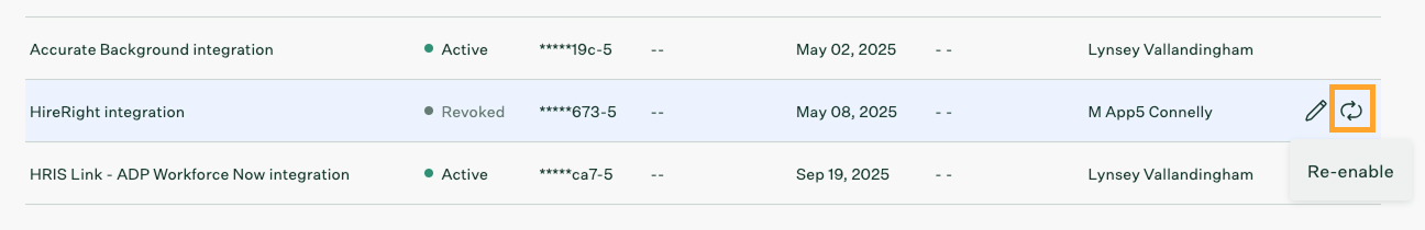 To do so, locate and hover over the credential you wish to revoke and click the Re-enable icon .