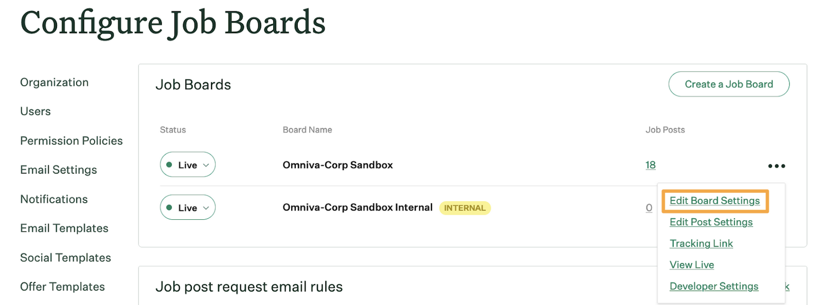 Click the Ellipsis icon beside your job board and select Edit Board Settings from the dropdown.