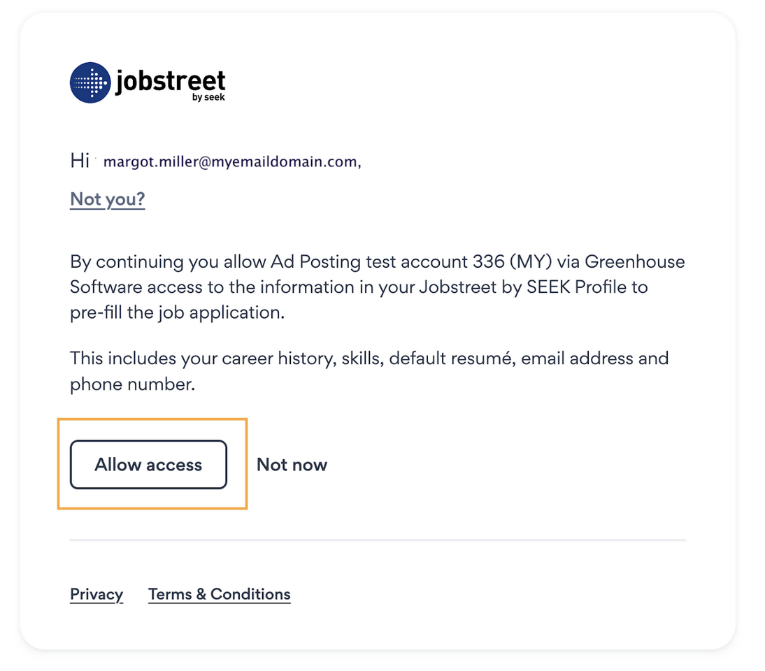 When a candidate clicks Apply with SEEK or Apply with Jobstreet, a SEEK pop-up appears requesting authorization to share profile data. The candidate must allow access to continue with the application.