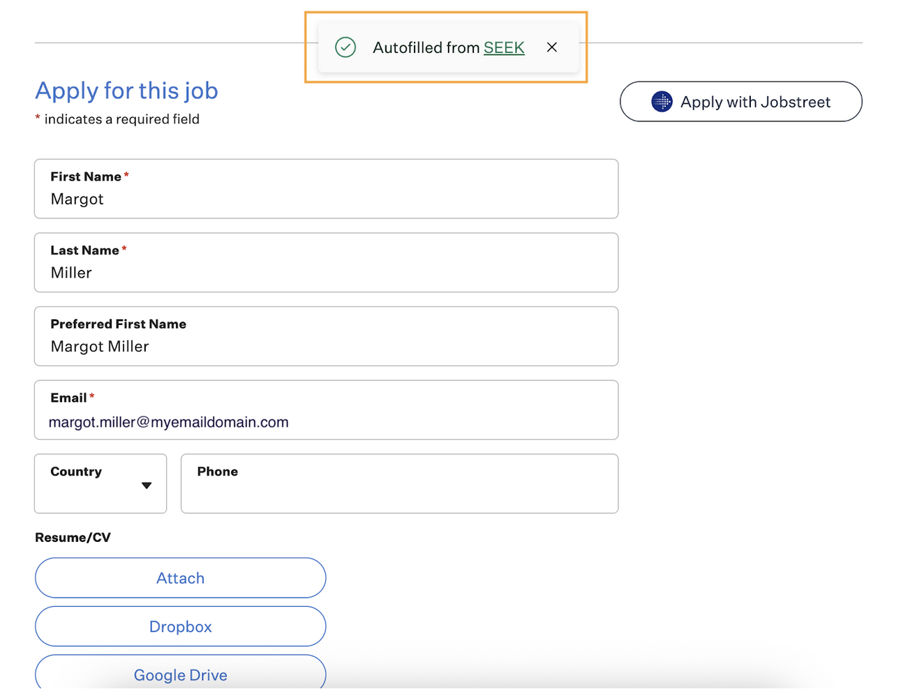 The application experience is further simplified through newly supported fields that automatically pre-populate when a candidate applies using Apply with SEEK.