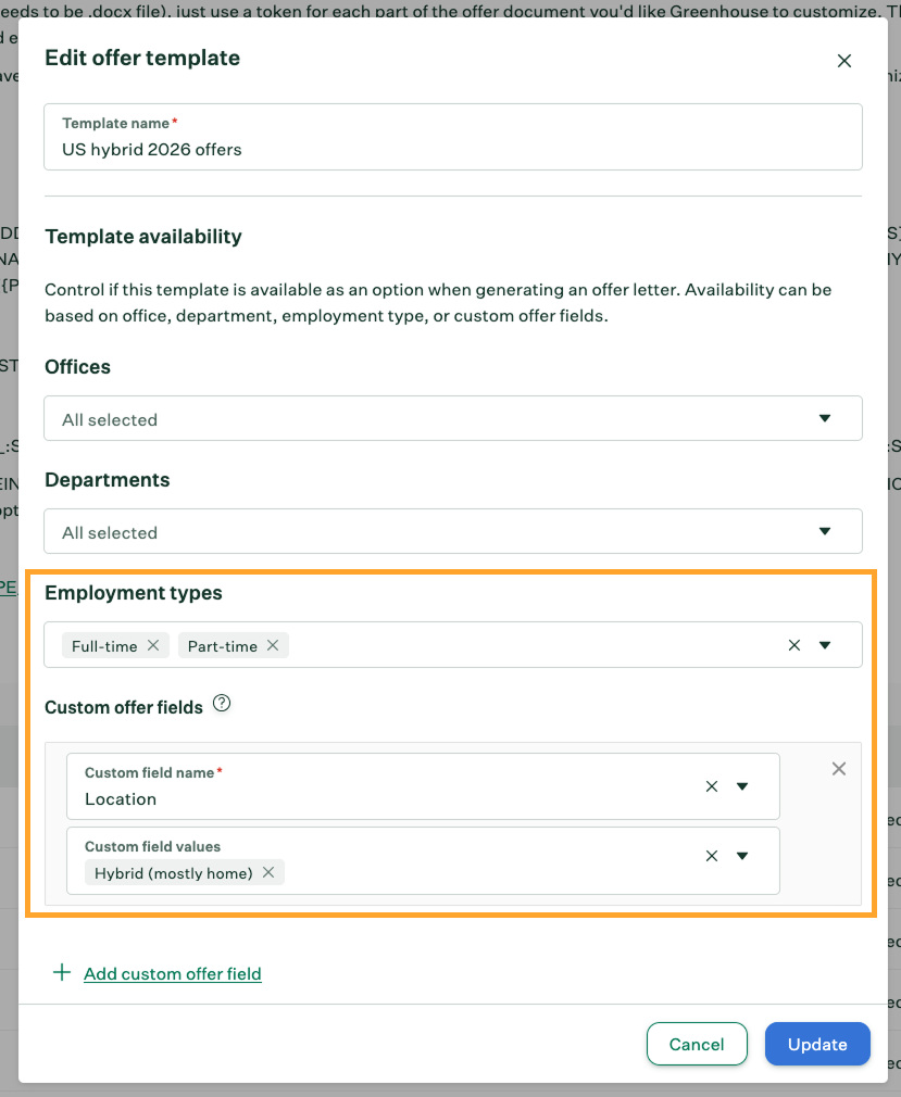 In the Template availability section, select one or more offices, departments, employment types, and/or custom offer fields to designate where the offer document template populates.