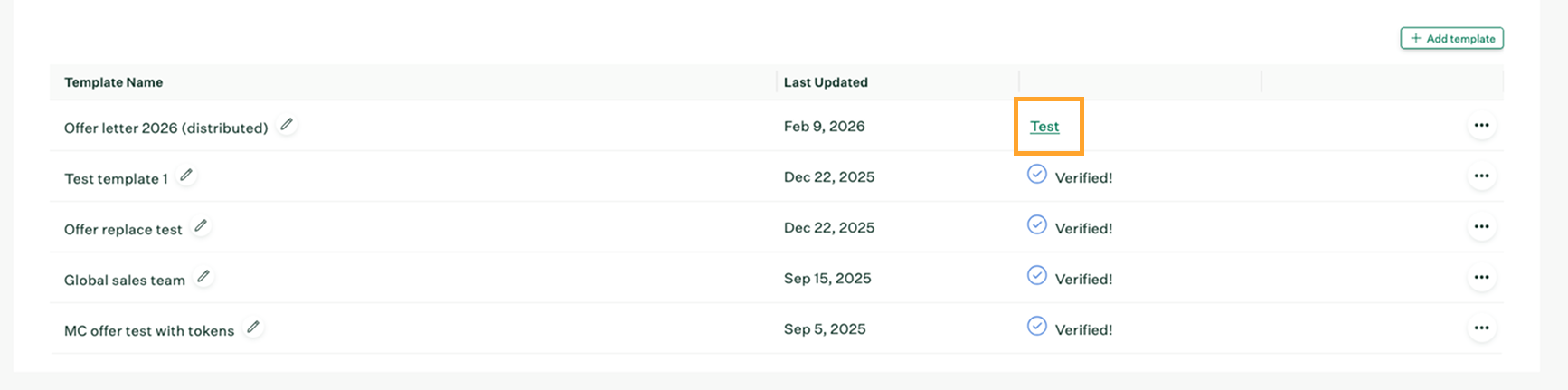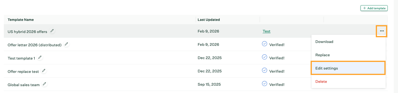 From the Offer Templates page, click + Add template to add a new template. If you want to modify an existing template, click the ellipsis (...) menu, then choose Edit settings.