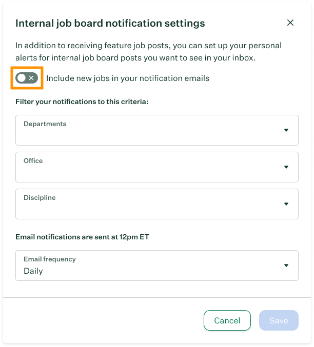 By default, your internal job email will contain all new jobs, but you can add filters so you're only notified about jobs that are relevant to you.