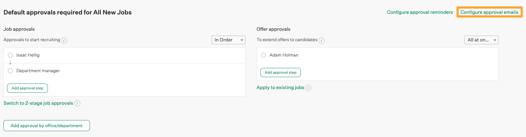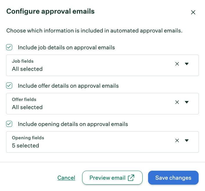 When a user requests approval on a job or offer, the listed approvers receive an automated email notification with the details of the job or offer.