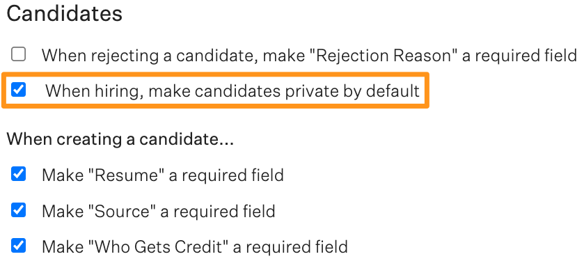 Under the Candidates section, place a checkmark next to the permission When hiring, make candidates private by default.