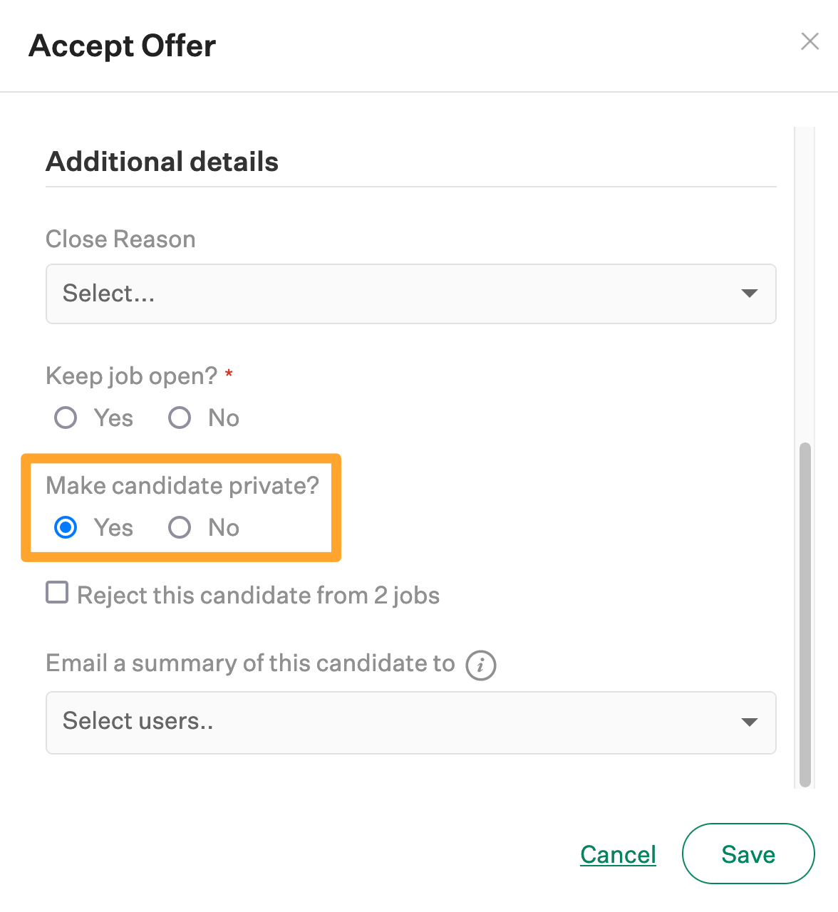With this permission set, when marking candidates as hired the 'Make candidate private?' field in the Offer Accepted dialog box will be set to Yes by default.