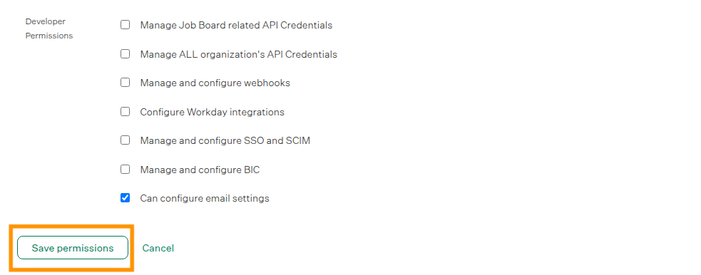 Developer permissions are a subset of user-specific permissions which allow a particular user to manage Greenhouse features related to APIs, webhooks, and certain integrations.