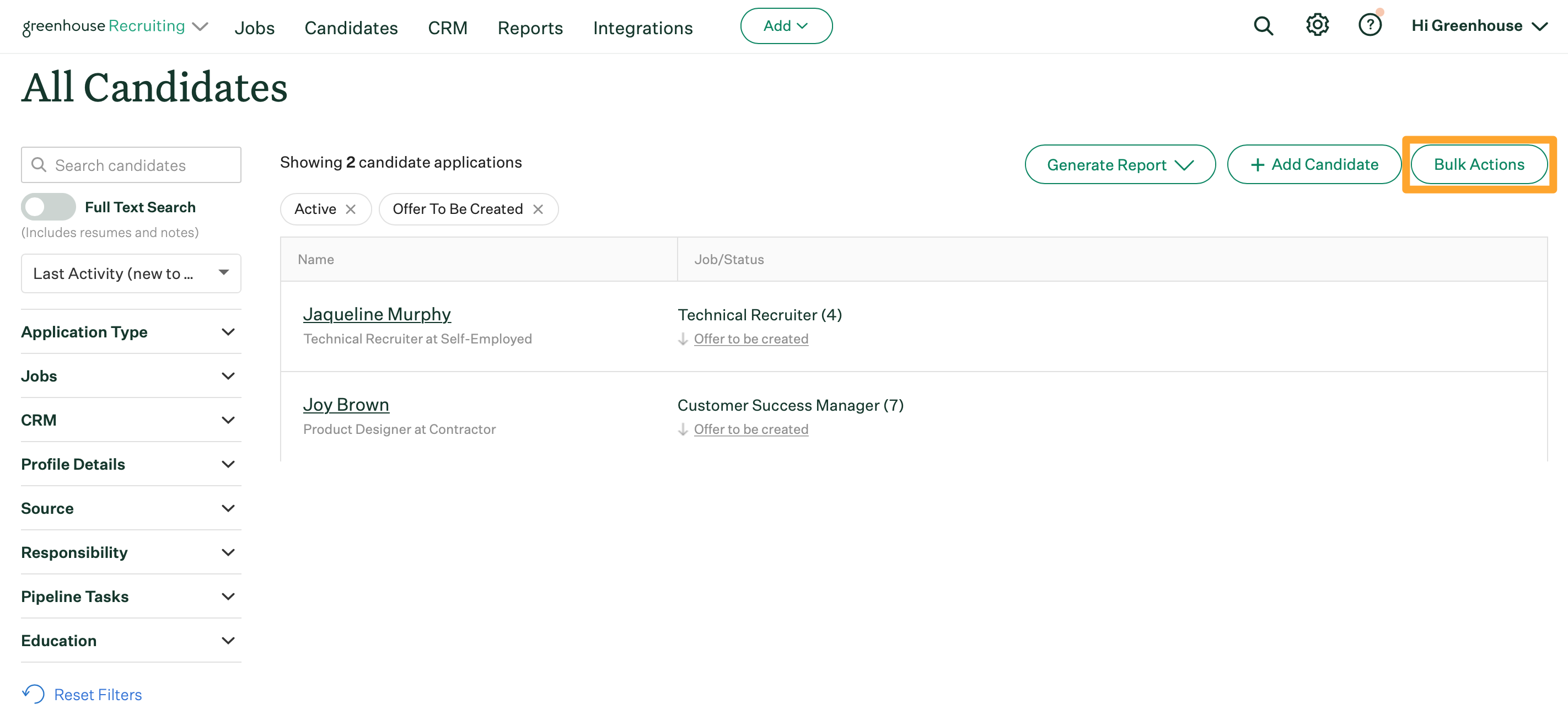 To create offers in bulk, click Candidates on your navigation bar. On the All Candidates page, apply any filters necessary (such as Pipeline Tasks > Offers > To be created) to generate your list of candidates, and then click Bulk Actions.