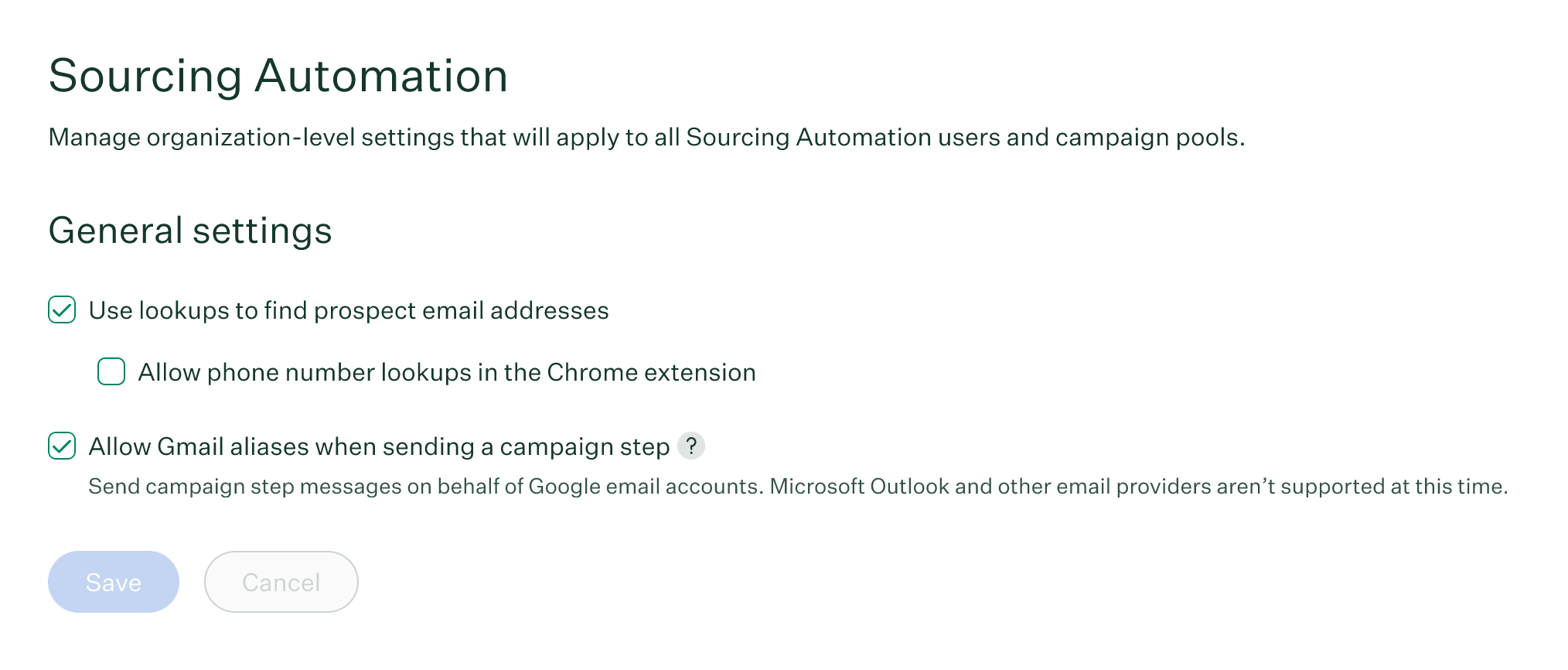 When these permissions are turned on, all Sourcing Automation users can perform lookups and send campaign messages on behalf of configured Gmail aliases.