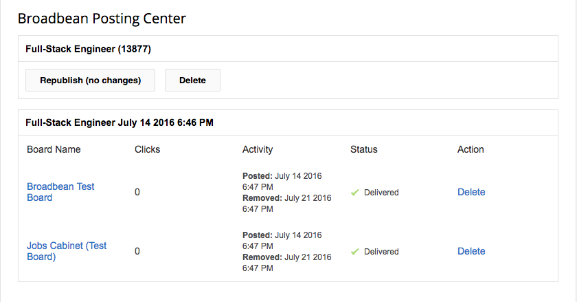 Once you send a job post to Broadbean, a new section on the job's Sourcing tab in Greenhouse Recruiting will show you the following details: