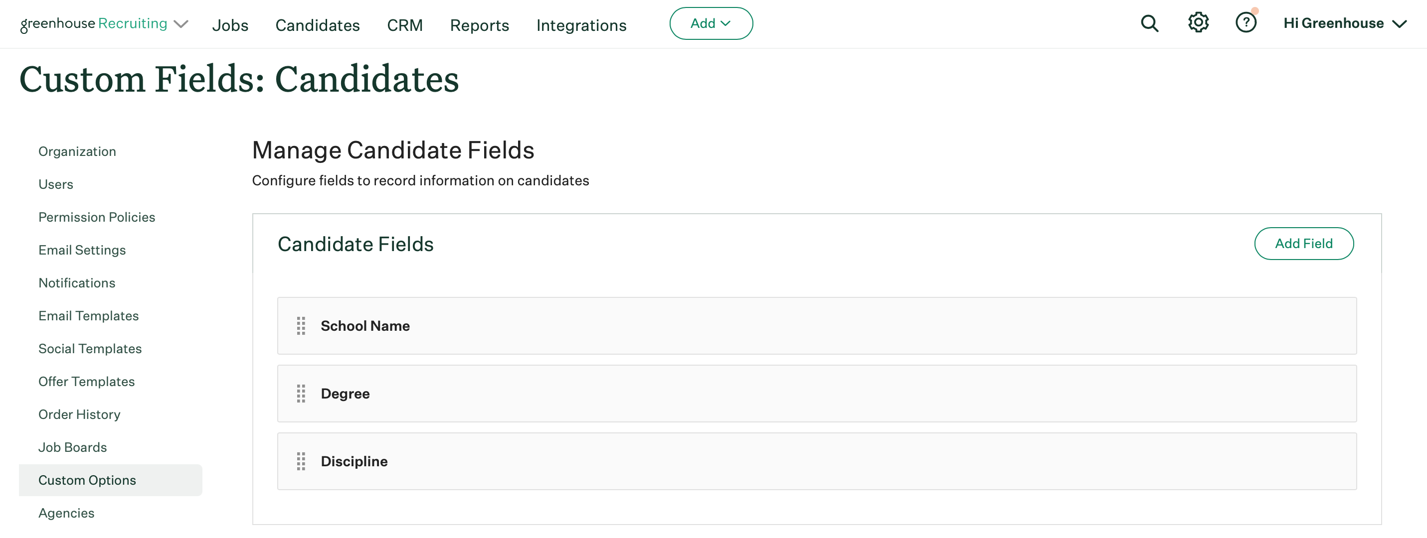 For your convenience, Greenhouse Recruiting provides default options for school name, degree, and discipline. While we've tried to provide a large array of options, the default lists are by no means exhaustive. Each of these fields are single-select and can hold a maximum of 5000 values.