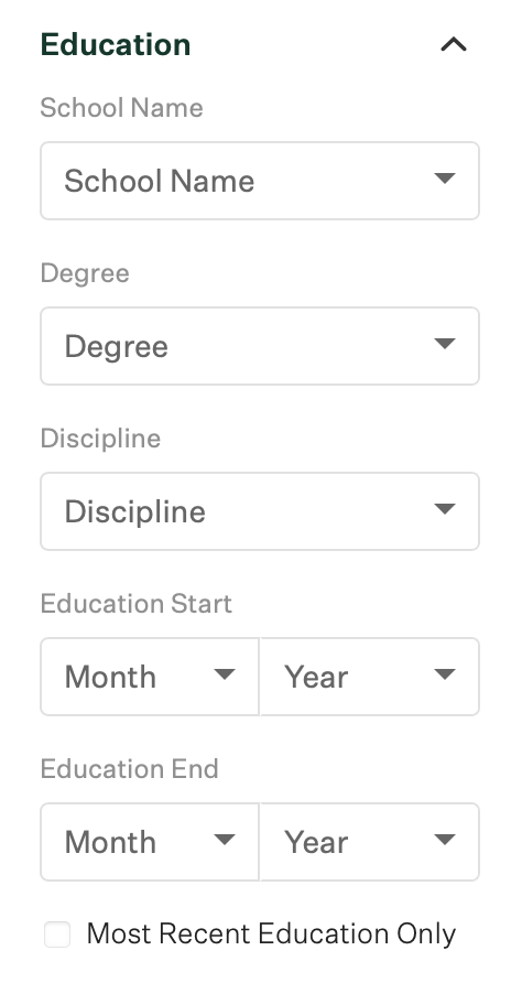 A powerful reason to capture a candidate's education history in a structured format is to enable more efficient searching of your candidate database. Click the Candidates tab on your navigation bar and expand the Education filter panel on the left-hand side.