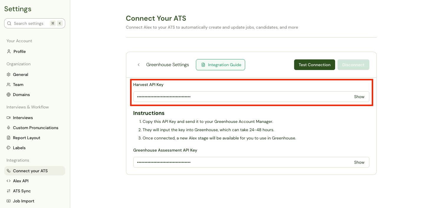 When logged in as an admin in Alex AI, go into Settings > Connect your ATS, and select Greenhouse.