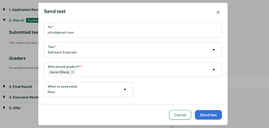 Note: When you send a test in Greenhouse Recruiting, the instructions are actually sent by Alex AI.