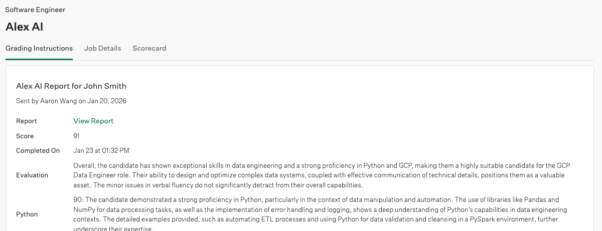 Once the candidate has completed their interview, the Interview Kit will contain an overall evaluation of how the candidate performed on the interview, as well as a link to view the report directly in the Alex AI dashboard. Additionally a note will be added to the application to indicate that the candidate completed the interview
