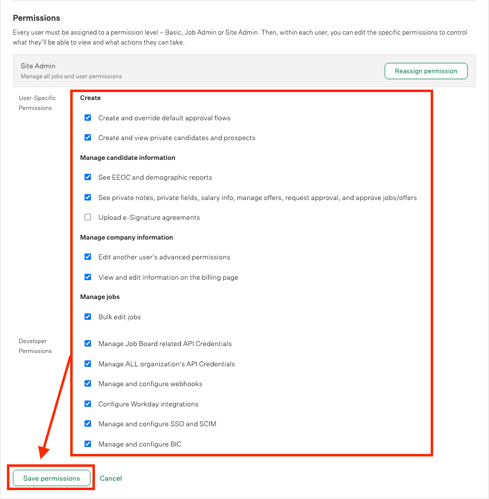 - Permissions: Site Admin with all available permissions under the user-specific permission.