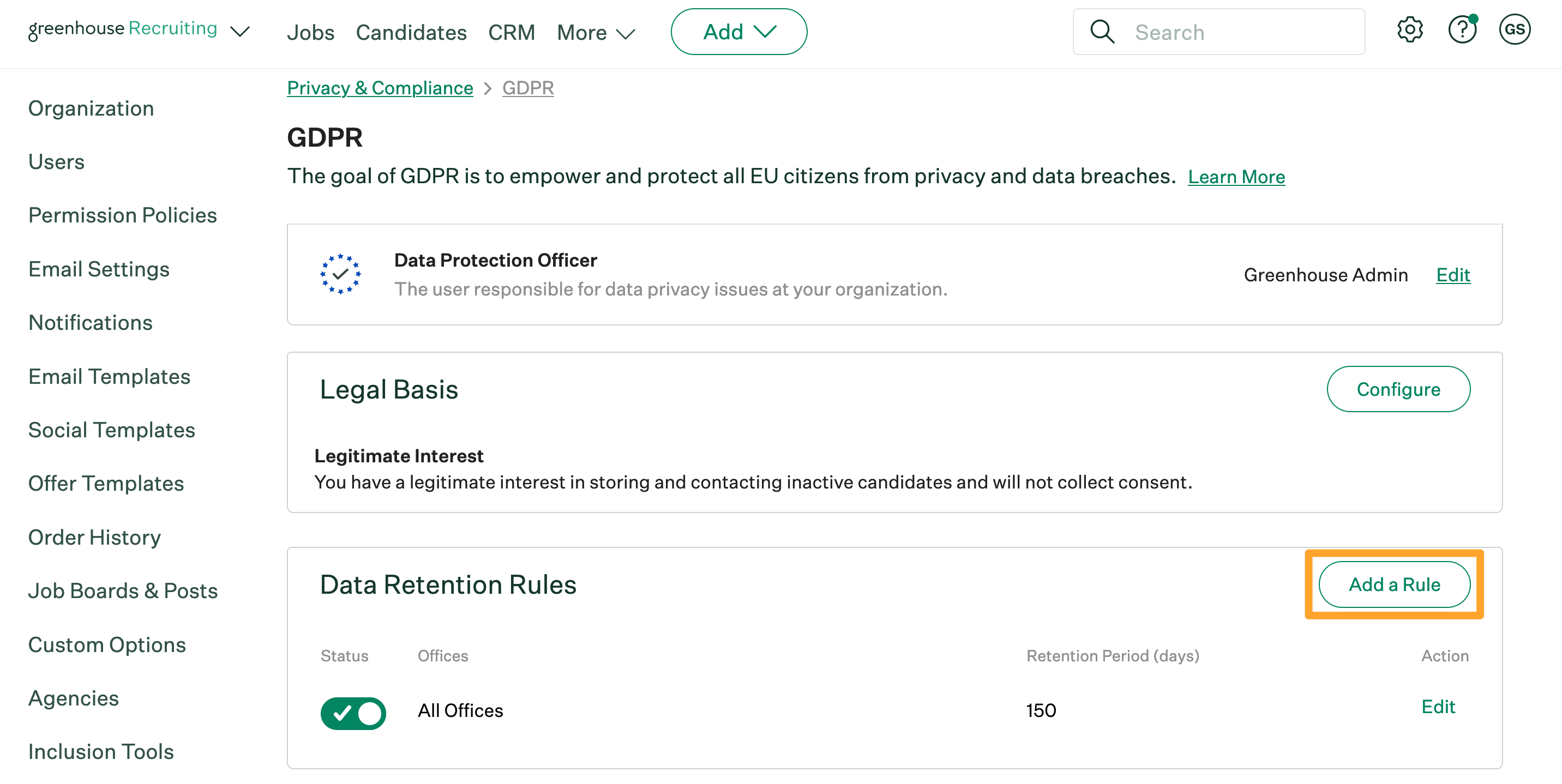 Greenhouse Recruiting allows your organization to control the data retention timeframe, data to be deleted, and notifications on a per-office basis with our data retention rules.