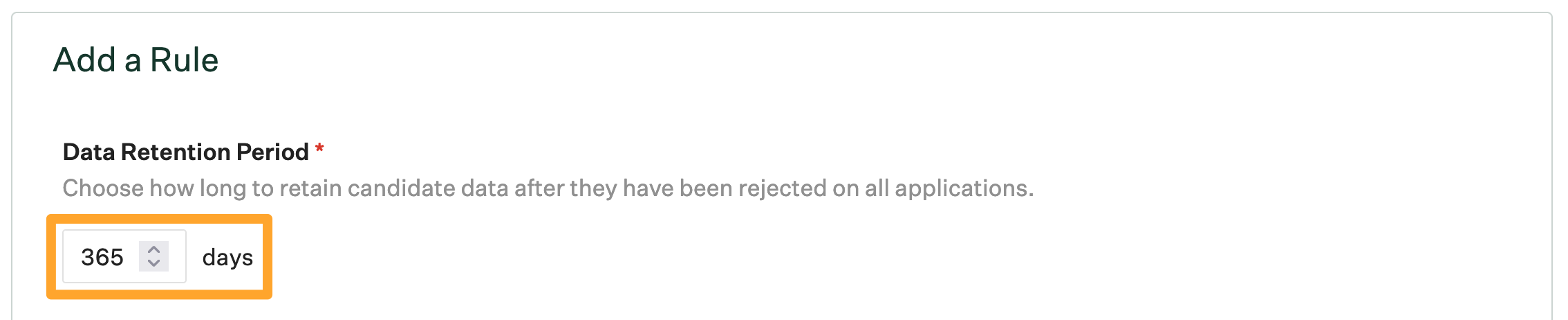From the subsequent Add a Rule panel, use the provided field to input how long (in days) your organization wishes to retain candidate personal data after they have been rejected on all applications.