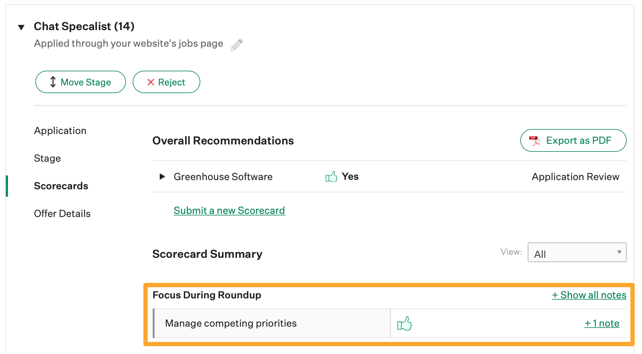 During the candidate roundup, your hiring team can view the summarized scorecards on the Scorecards tab of the candidate's profile.