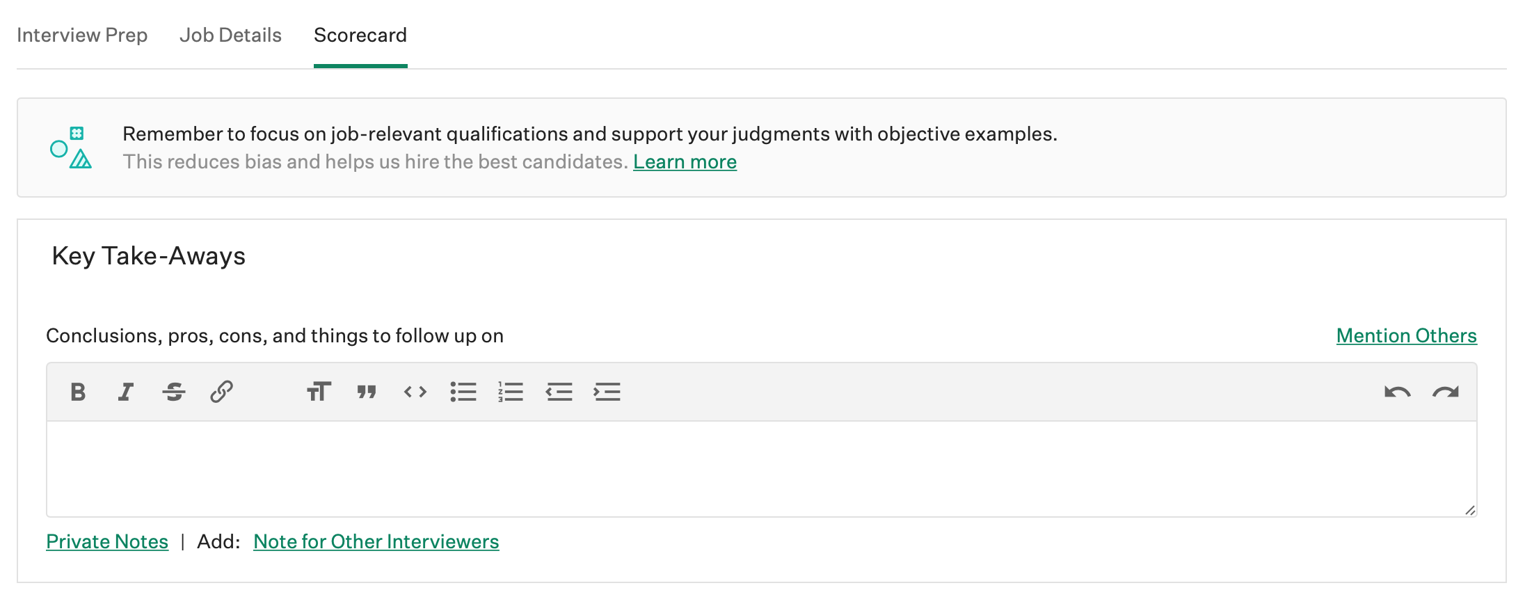 Greenhouse Recruiting provides a suite of features to help your organization articulate and consistently apply important criteria for a job throughout the hiring process based on the cited research. Moreover, using select features, interviewers can be forced to justify the decisions throughout the hiring process. For example, activate an "inclusion nudge" that will appear when an interviewer is filling out a scorecard.