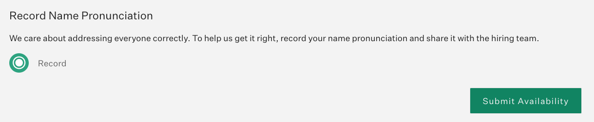 If Prompt candidates to record their name pronunciation is activated, candidates will see an option to record their name when submitting their availability for an interview. The recording will be available to interviewers from the candidate's profile and from within the Interview Kits. Click here to learn more.