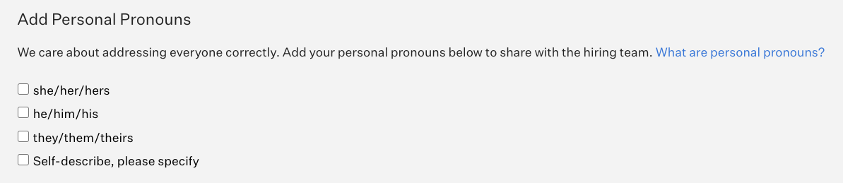If Prompt candidates to provide their personal pronouns is activated, candidates will see an option to provide their personal pronouns when providing interview availability. Click here to learn more.