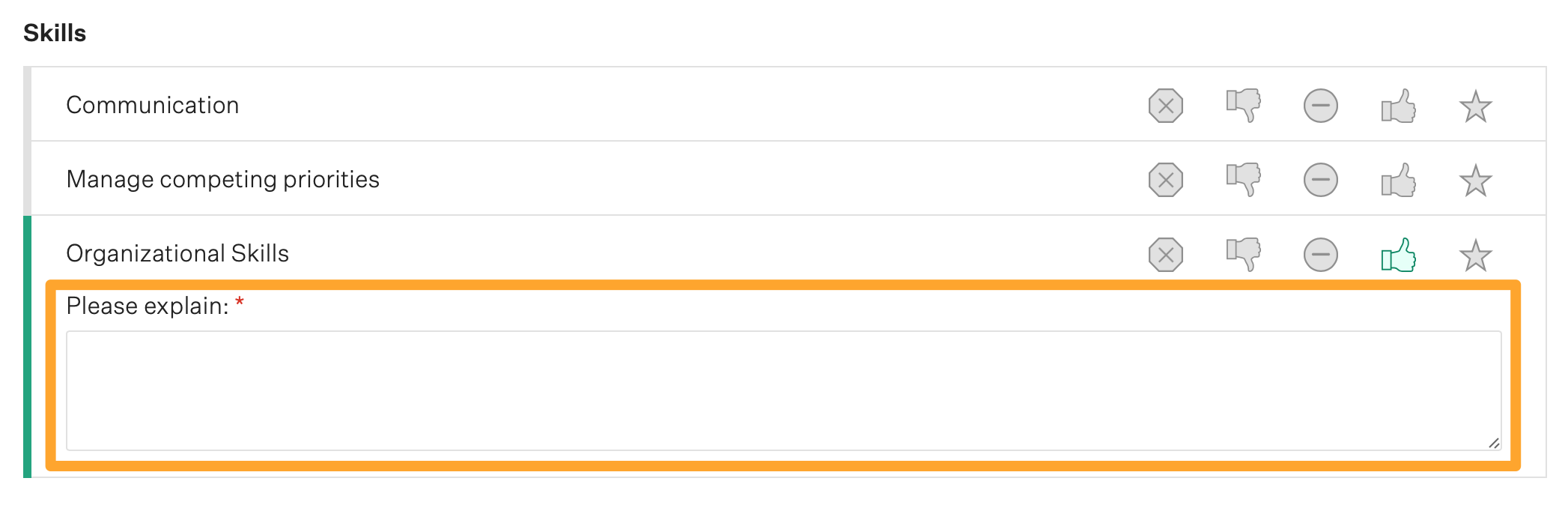 If the Remind interviewers to add a note when rating an attribute feature is activated, you will have the additional option to make this reasoning optional or required by selecting the appropriate box. If required, interviewers will need to explain their reasoning for each rated attribute.