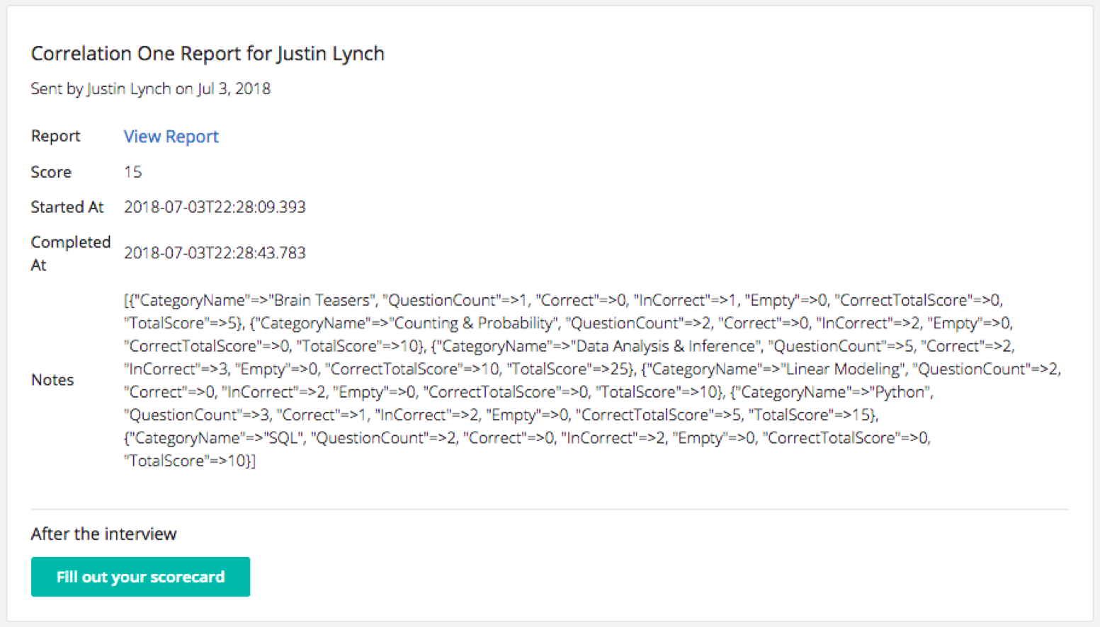 Once the candidate has submitted their test, the Interview Kit will contain a link to view the submitted test in the Correlation One application.