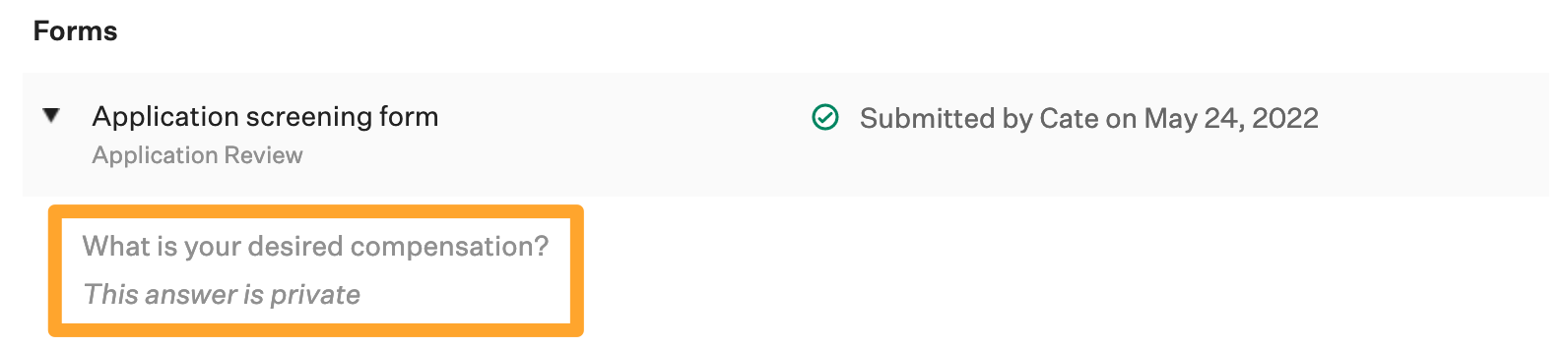 If a question is marked as Private, users without one of the permissions listed above will see the candidate responded to the question, but cannot see the candidate's response.
