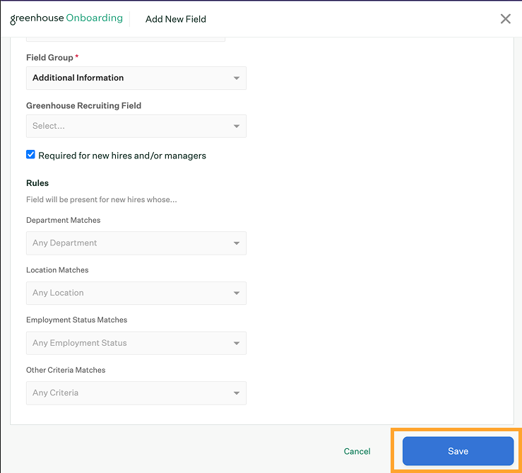 | Required for new hires and/or managers | Mark this checkbox to require new hires or their managers to fill out this field during the onboarding process. |