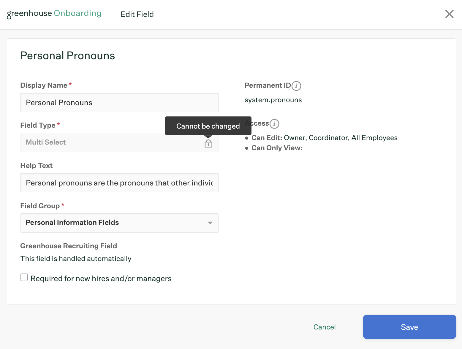 | Display name | The name that Greenhouse Onboarding users will see when filling out your new field. |