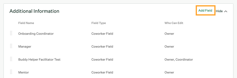 | Selection options | If your new field uses the single select or multi select field type, add options for your new hires to select from when they fill out this field. For example, if your field asks for a new hire's favorite color, include each color as a selection option. |