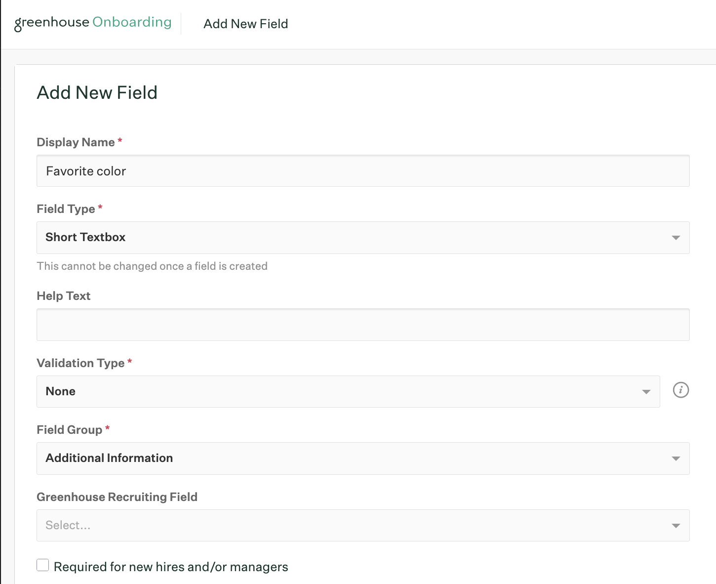 | Greenhouse Recruiting field | If you've integrated your Greenhouse Onboarding account with Greenhouse Recruiting, you can map your new field to a corresponding field in Greenhouse Recruiting. This allows you to pull relevant candidate information into Greenhouse Onboarding when the candidate is hired. |