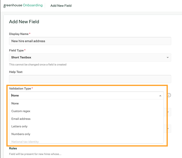 | Validation type | For short textbox fields, set a format rule to control how new hires enter data into this field. See Add field validation for details on available validation types. |