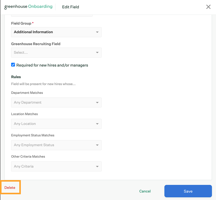 Note: The following fields can't be deleted from Greenhouse Onboarding or Greenhouse Welcome: