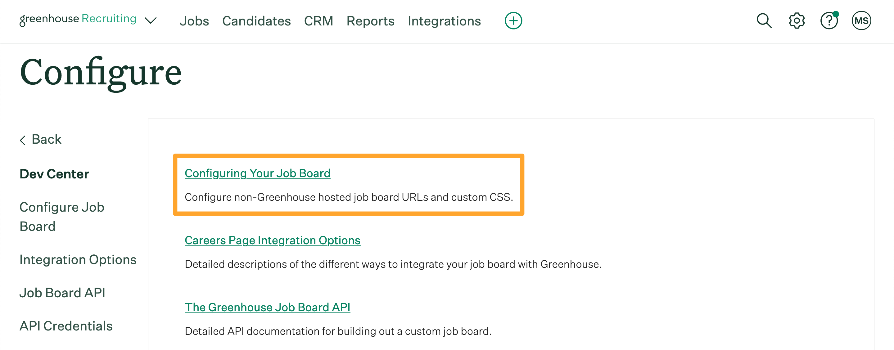 To configure your job board URL, click the Configure icon on your navigation bar, then click Dev Center on the left.