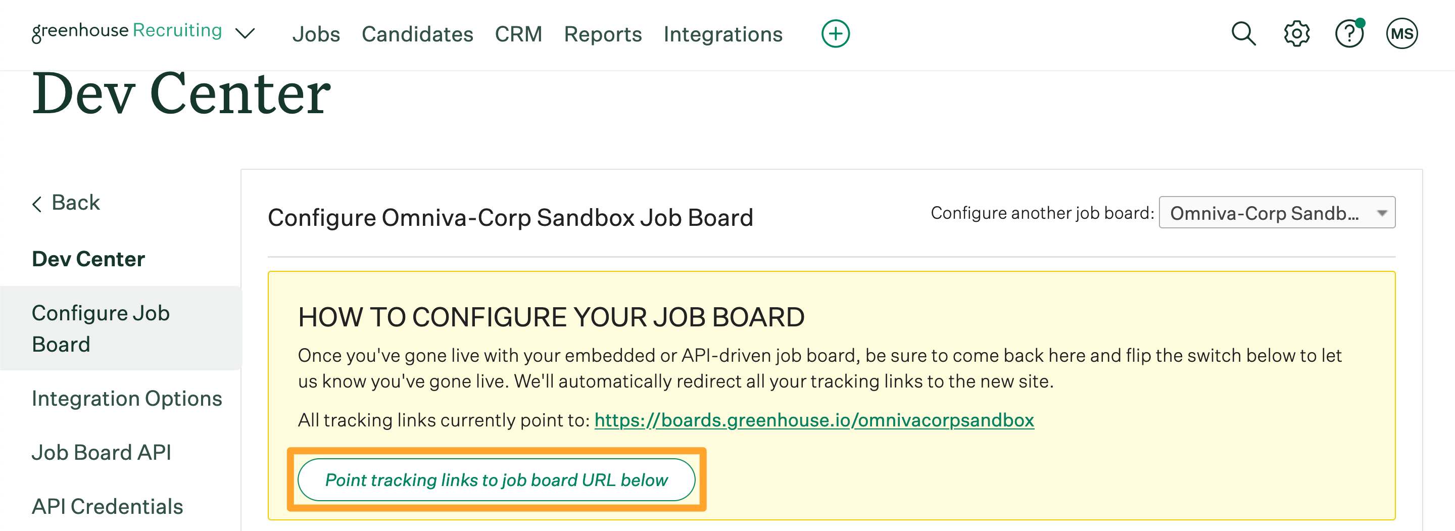 A message will indicate which job board URL is in use for this particular job board. Click Point tracking links to job board URL below to direct tracking links to your careers page.