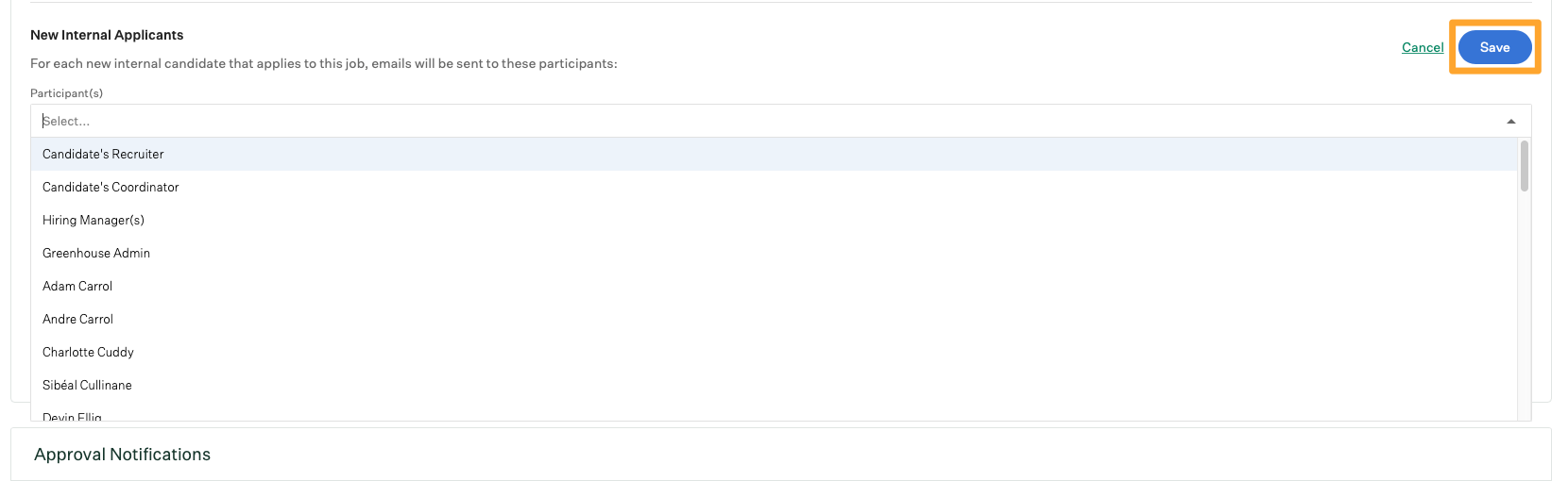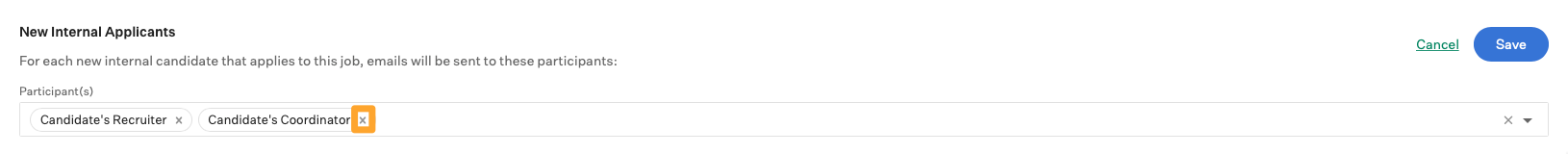 To add users to the notification list for new referrals, click the Participant(s) dropdown and select the appropriate user. You can select a user by name, or you can select the Hiring Manager(s) listed on the job's Hiring Team, the Candidate's Recruiter, and/or the Candidate's Coordinator.