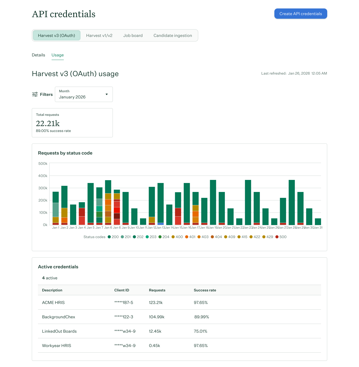 The usage tab in API Credentials gives technical administrators visibility into how Harvest v3 credentials are being used. Use it to monitor request volume, track error rates by status code, and see which credentials are most active — helping you catch integration issues and understand your usage over time.