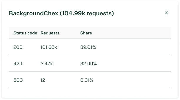 Use this chart to identify spikes in error responses. A sudden increase in 4xx codes, for example, may indicate an authentication problem or a misconfigured integration hitting endpoints it shouldn't be accessing.