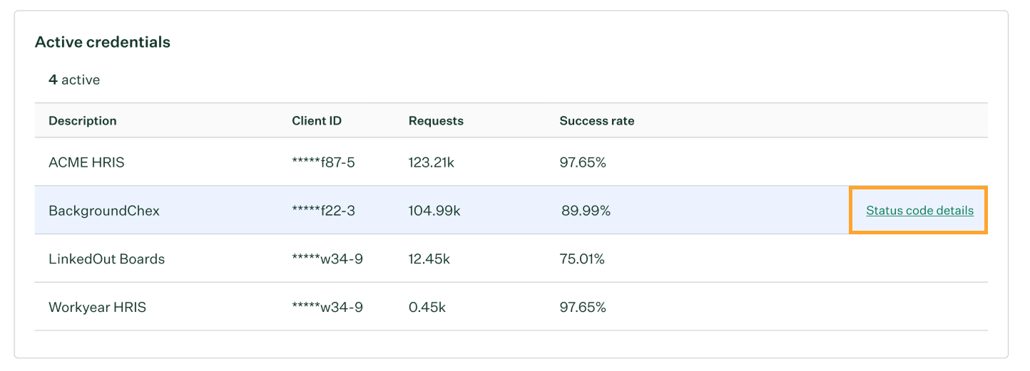 For credentials with notable error rates, click Status code details to see a breakdown of that credential's responses by status code.