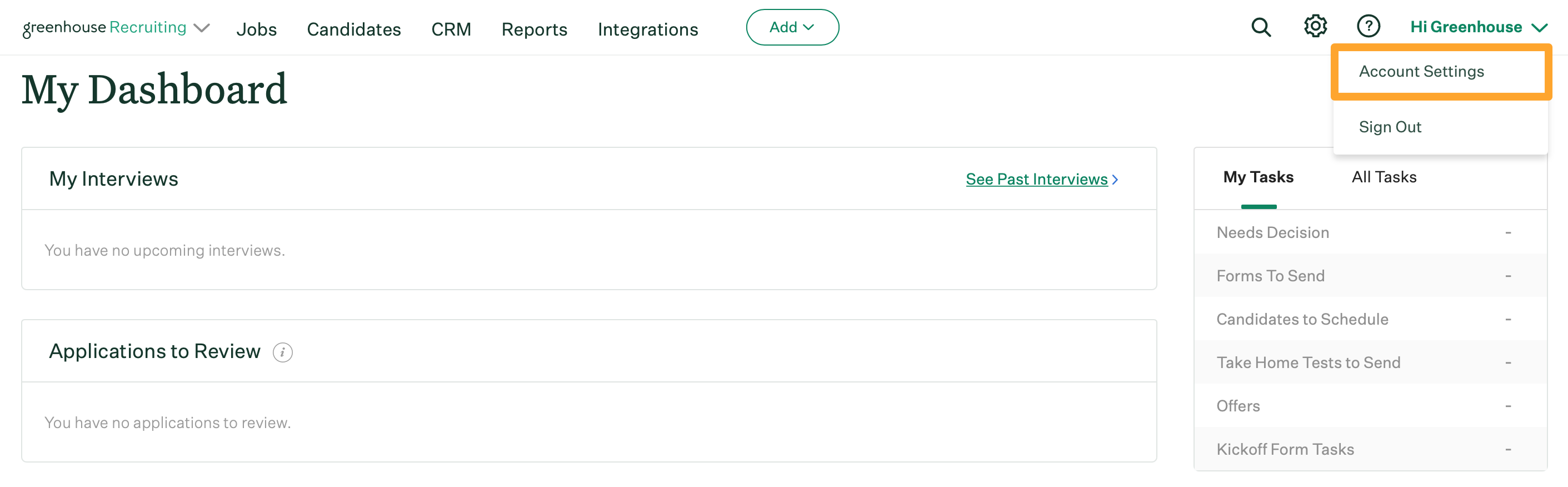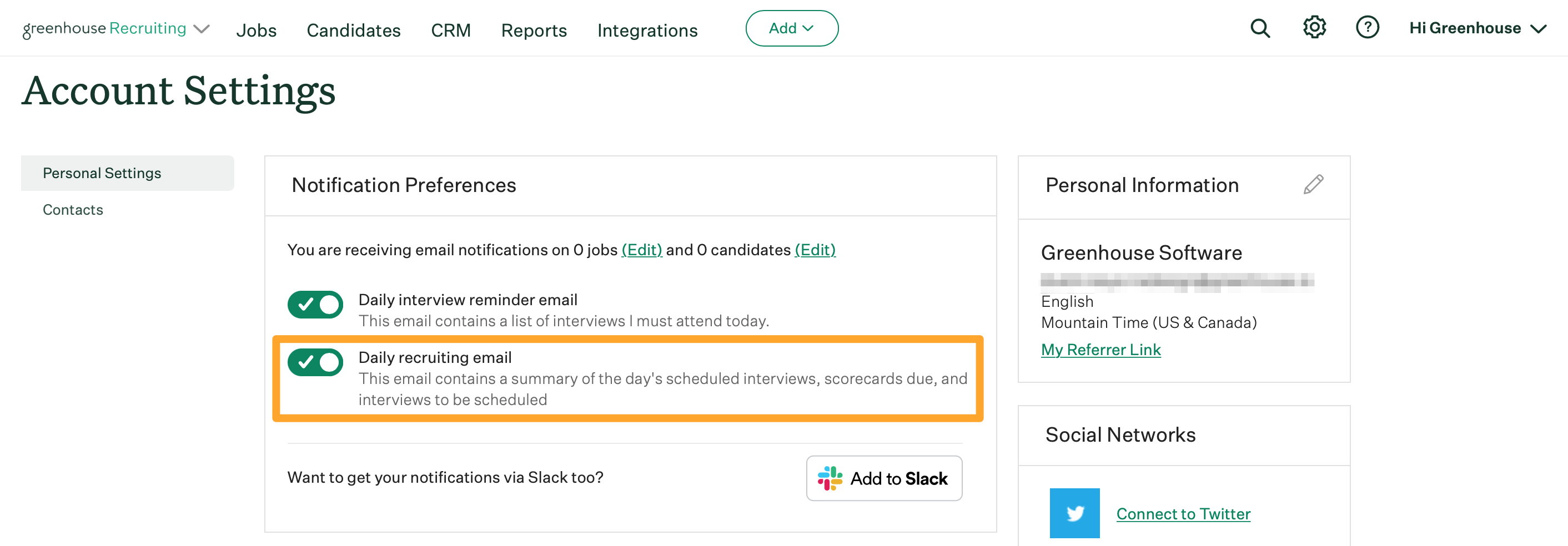 To enable or deactivate the daily recruiting email, click Hi Greenhouse on your navigation bar and select Account Settings from the dropdown.