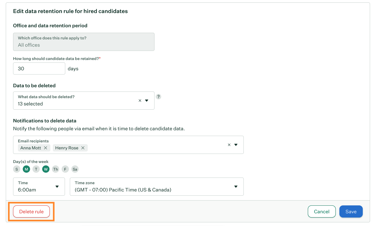 Rejected candidate data retention rules can be deleted by office. Hired candidate retention rules can only be deleted for your whole organization.