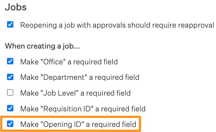 When your team enables the Make Opening ID required for all jobs permission policy, opening IDs become required for all openings on your jobs. Enabling this permission policy will have two impacts: