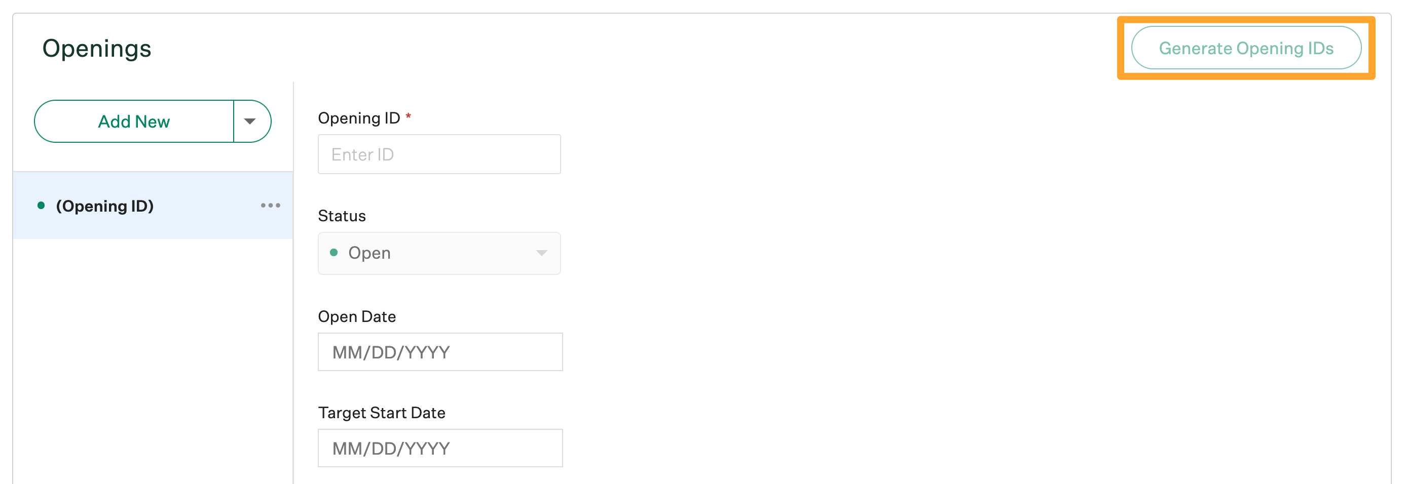 - When creating a new job, a user will be prompted to either use the Generate Opening IDs button or manually enter opening IDs for each opening on the job. The Generate Opening IDs button will only be available if the user has first provided a requisition ID for the job. This step will be completed during the new job setup flow on the Job Info page.