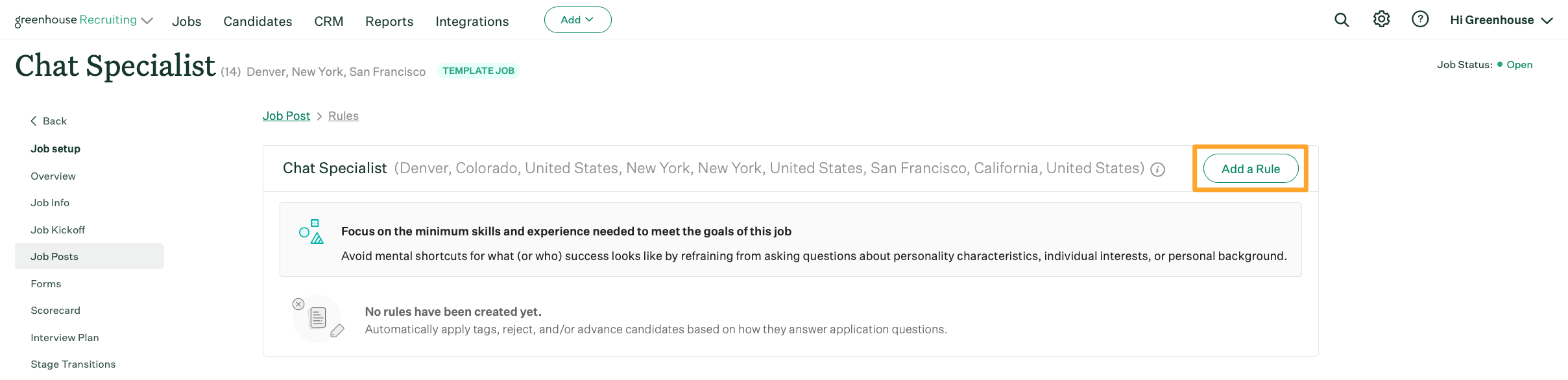 Note: The workflow to add an application rule includes Nudges that help remind users to configure automated processes thoughtfully. We encourage your team to configure application rules based on need-to-have qualifications that are directly relevant to the role. This ensures candidates from non-traditional professional backgrounds receive fair consideration, and avoids job post questions about personality characteristics, individual interests, or personal background. By focusing your questions this way, your roles are more likely to attract a diverse and uniquely qualified pool of candidates.