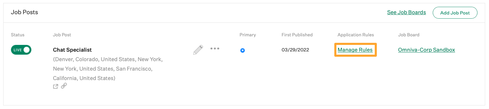 With the custom job post question created, you can now assign an auto-advance application rule to a response. From the Job Posts page, click # rules or Manage Rules under the Application Rules column.